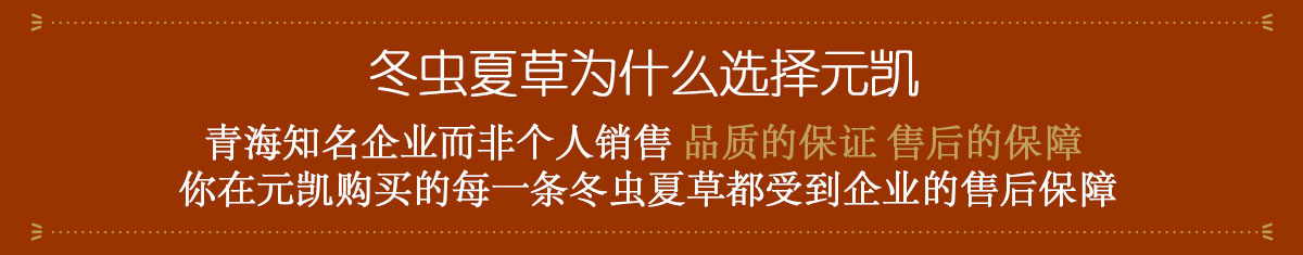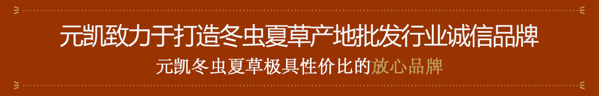 公司專業(yè)致力于青藏高原野生冬蟲夏草銷售、采收、精選包裝和現代化生產、研發(fā)等,并且在青海玉樹西藏那曲設立了采購站,專門采購地道的野生冬蟲夏草,充分保證了產品的品質。元凱長期向國內眾多著名藥材經銷商、港澳臺以及東南亞中藥材采購商供應冬蟲夏草,多次被省、市、縣授予多種榮譽稱號“青海省知名商標”、“青海省誠信單位”、“青海省名優(yōu)企業(yè)”、“守合同重信用企業(yè)”等。